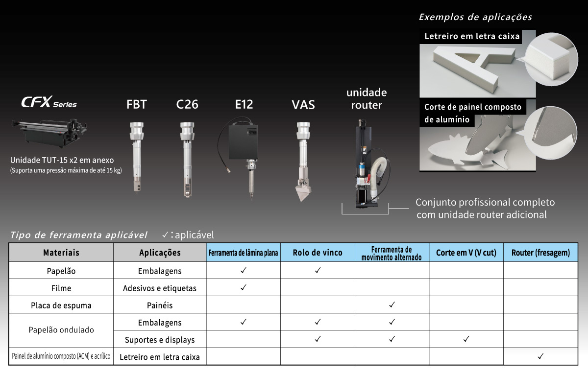 Este modelo de conjunto atende à produção de comunicação visual em geral, incluindo o corte de acrílico e painéis de alumínio composto, com a adição de uma unidade router.